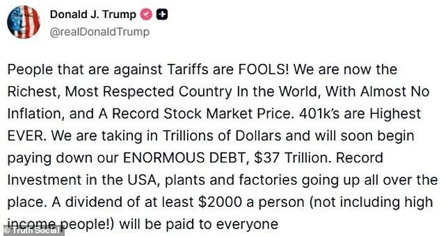 川普在Truth Social 上语气强烈地说:反对关税的人都是傻瓜!我们现在是世界上最富有、最受尊敬的国家,通货膨胀率几乎为零,股市也创下历史新高。401k退休金账户余额也达到了历史最高水平。我们每年收入数万亿美元,很快就能开始偿还高达37万亿美元的巨额债务。美国的投资额创下历史新高,工厂和企业如雨后春笋般涌现。每个人都将获得至少2000美元的支票(高收入人群除外!)。