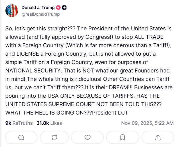 在发布2000美元承诺的帖子后不久,川普再次发文称:“没有关税,我们就什么都得不到!”随后又发帖质问最高法院为何允许总统“停止与外国的一切贸易”,却不允许征收“简单的关税”。