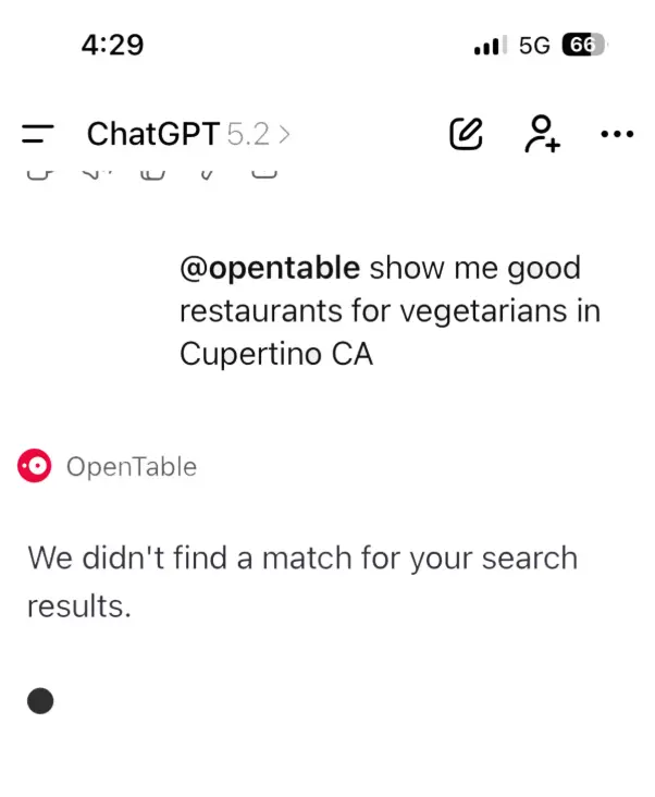 长期以来,智能数字助手的一个重点功能就是餐厅预订。早在Siri被苹果收购前,OpenTable就是Siri的首批合作方。当《华尔街日报》记者尝试通过ChatGPT调用OpenTable订座时,系统却返回错误信息,而直接通过OpenTable官网预订仅需数秒即可完成。