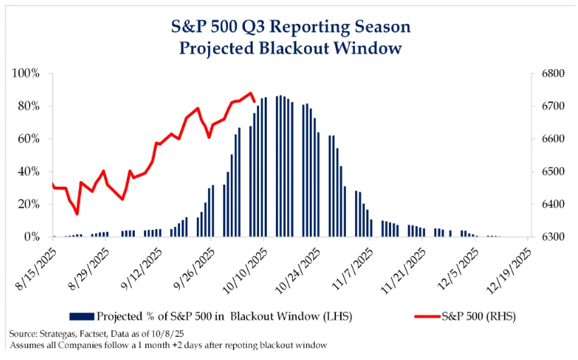 Strategas的投资策略研究主管 Ryan Grabinski指出,未来两周市场将处于股票回购静默期的高峰窗口。考虑到对经济增长的担忧,这可能会开启一段疲软期。但好消息是,随着年末临近,企业回购需求将在11月初重新抬头。