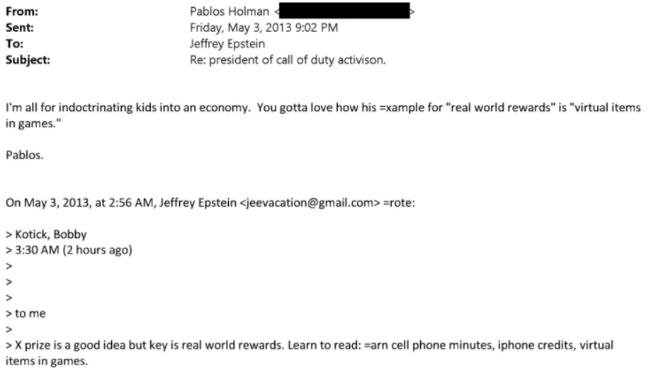 在上周五公布的超过三百万份“爱泼斯坦档案”中,新曝光的邮件往来显示,爱泼斯坦、未来学家帕布洛斯·霍尔曼(Pablos Holman),以及动视前CEO鲍比·考迪克(Bobby Kotick,是的,又是他)之间,曾讨论过如何通过游戏内外观道具来“让孩子接受一套经济体系的洗礼”。