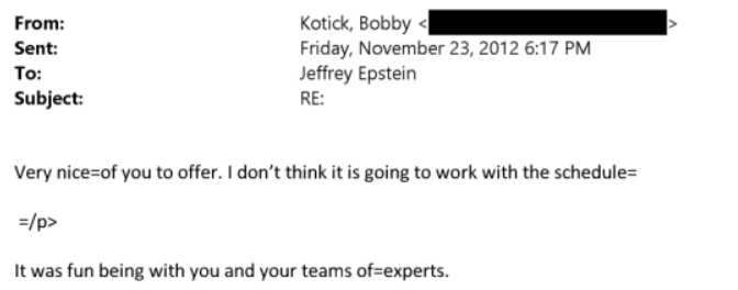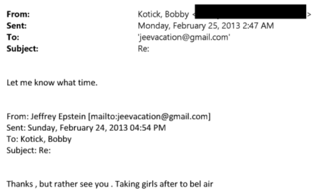 然而,当爱泼斯坦在2013年的一封邮件中提到,他和“那些女孩”将前往SpaceX见埃隆·马斯克,并表示之后会“把女孩们带去贝莱尔”时,考迪克的回复是:“告诉我具体时间。”