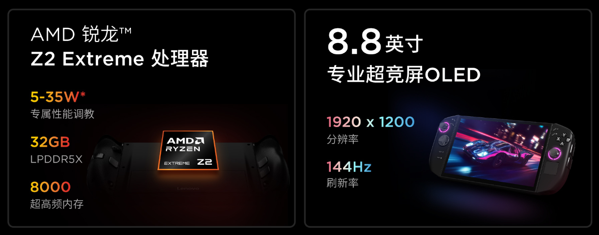 性能方面,LEGION GO 2搭载AMD专为掌机打造的锐龙Z2 Extreme旗舰处理器,基于Zen 5架构打造,拥有8核16线程规格,最高加速频率可达5.0GHz。