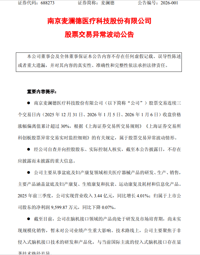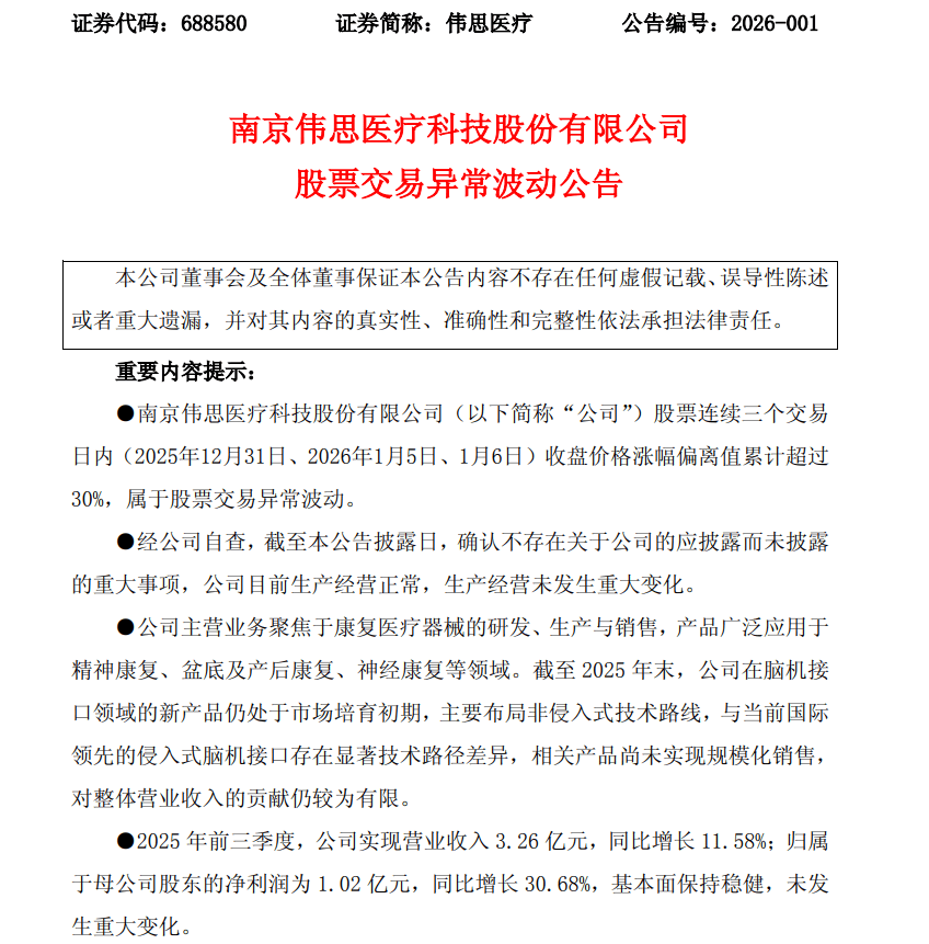 近期,脑机接口等概念股持续飙涨。截至1月6日,已有多只概念股连续三个交易日收盘价涨幅偏离值累计达到30%。对此,多家上市公司1月6日晚发布股票交易异常波动公告,称在脑机接口领域的新产品仍处于市场培育初期,且与国际主流存在显著技术路径差异。