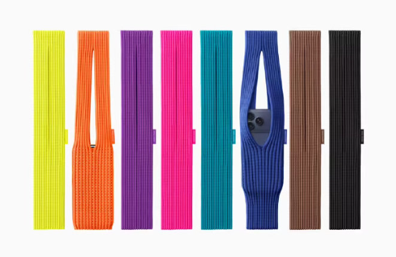 拉伸时,织物微微透出内部物品,方便用户查看iPhone屏幕,其还可手持、系在包上,或直接佩戴在身上。