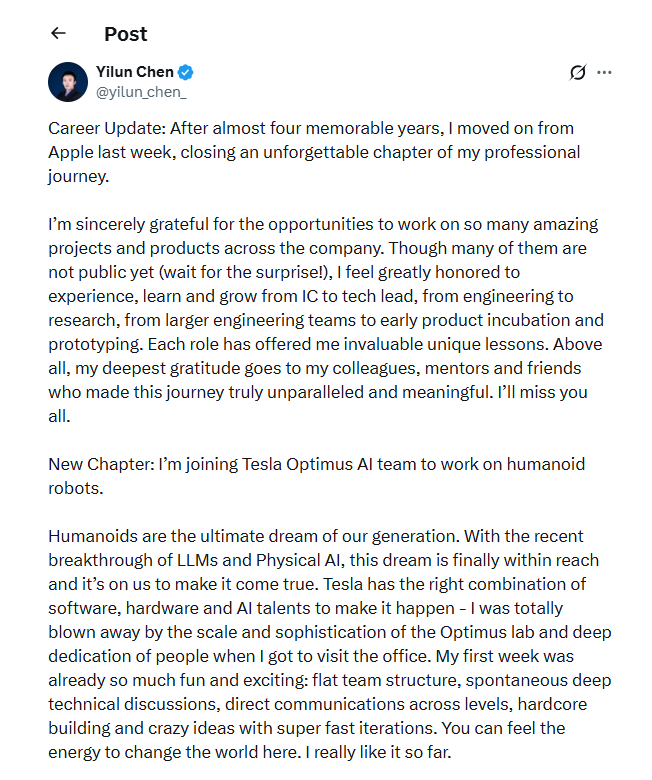 他还表示,在入职特斯拉的第一周,团队内部自发而深入的技术讨论、扁平灵活的组织结构以及快速迭代的原型开发流程,都让他感到振奋。