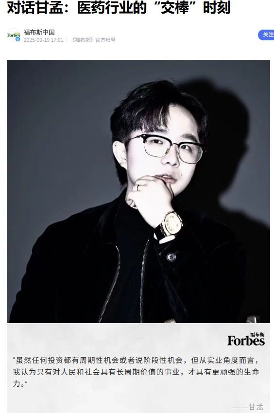 公开信息显示,甘孟的身份更偏向一名医药产业的投资人。一篇由《福布斯中国》发布的文章显示,甘孟参与创办值的医疗时,就是以投资人身份下场。在这篇文章中,甘孟表示,持续稳定的现金流是其关注的终极指标。