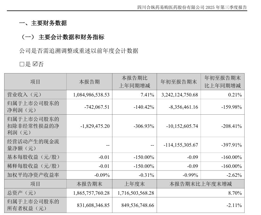 值得注意的是,甘孟在前文中提到的现金流,体现在药易购身上却并不乐观。2025年半年报显示,药易购经营活动产生的现金流量净额为-727.50万元,而2024年同期为337.68万元;2025年年初至三季报期末,该数据为-1.14亿元,同样由正转负。