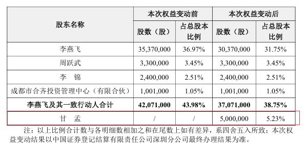 这次股份转让后,李燕飞及一致行动人持股比例降低至38.75%;甘孟在交易前未持有公司股份,协议转让后,持股占比为5.23%。