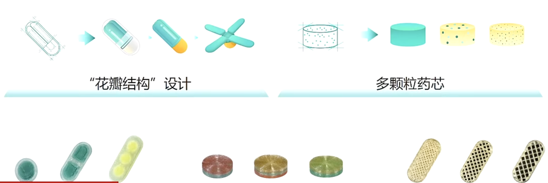 但光控制温度还不够,3D 打印最牛的地方在于它的“程序化释放”能力。比如,研发人员可以根据治疗需求,在药片内部设计出多腔室结构:最外层可以快速释放药物起效,里面可以包裹两三种甚至更多的不同成分,每种成分按照预定的时间释放。