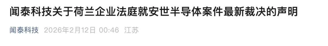 安世母公司闻泰科技对此表示“极其失望与强烈不满”,强调将继续通过一切法律途径捍卫自身权益。