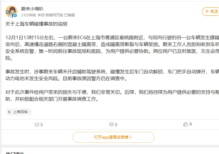 蔚来EC6上海发生碰撞事故 官方回应:涉事车辆未开启辅助驾驶系统 Source 12月1日,蔚来小喇叭发布关于上海车辆碰撞事故的说明。官方表示,12月1日13时15分左右,一台蔚来EC6在上海市青浦区垂姚路附近与同向车辆发生擦碰,随后变向高速撞向道路右侧混凝土隔离带,导致隔离带断裂、车辆受损。蔚来工作人员即刻收到车机安全系统告警,第一时间前往事故现场和医院,为用户提供必要协助。两位用户已及时就医,无生命危险。 根据蔚来官方说明,涉事蔚来车辆未开启辅助驾驶系统。碰撞后车门自动解锁、门把手弹开,车辆动力电池未出现安全风险。目前事故具体原因仍在警方调查中。 蔚来表示,对事件给用户造成的不便与损失非常关切,将持续提供必要支持,并积极配合相关部门调查工作。