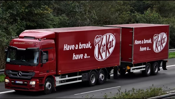 有加拿大网友拍到,一辆印着KitKat巨幅logo的红色卡车在高速上疾驰,周围簇拥着4辆纯黑凯迪拉克SUV——这可是美国总统出行的标准配置。
