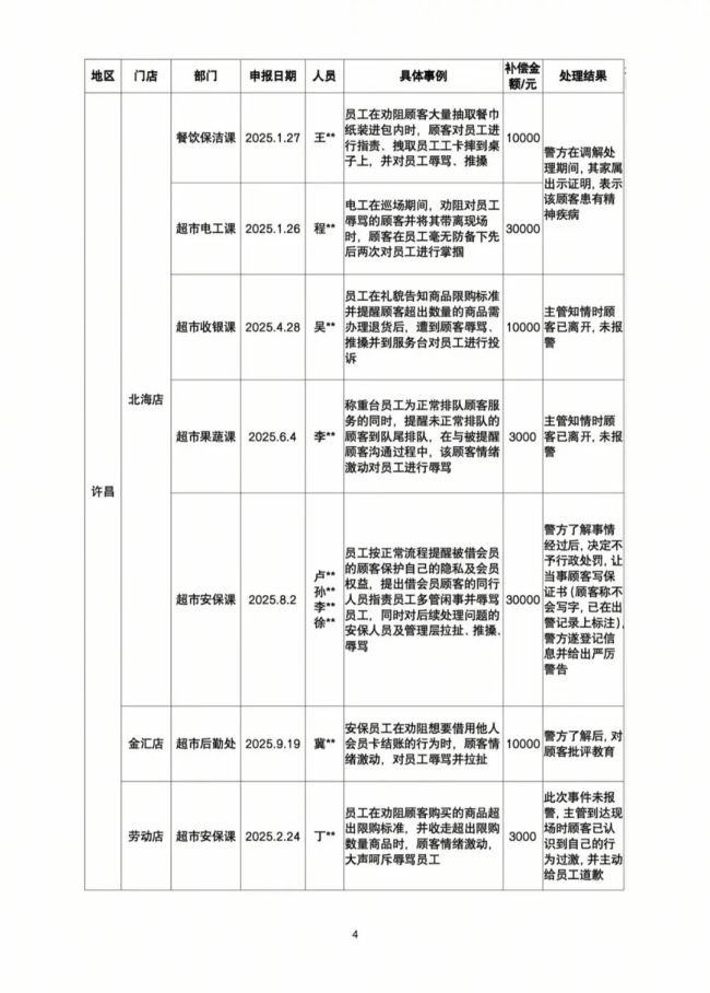 其中一则案例写道:2025年1月26日,许昌北海店,超市电工程某某在巡场期间,劝阻对员工辱骂的顾客并将其带离现场时,顾客在员工毫无防备下先后两次对员工进行掌掴,警方在调解处理期间,其家属出示证明,表示该顾客患有精神疾病。随后,胖东来补偿该员工30000元。