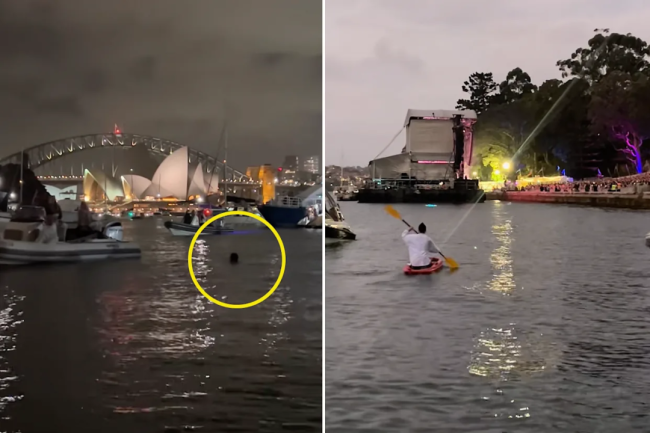 这位哥们大概率是为了听英国歌手Olivia Dean的演唱会。因为当晚她在Mrs Macquaries Point Fleet Steps 开演唱会,门票秒光,抢不到的人就纷纷开船漂到港湾里蹭听。