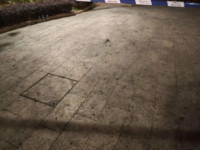 (封锁线外,地面上呈黑色的颗粒状崩落物 郑晨烨/摄)