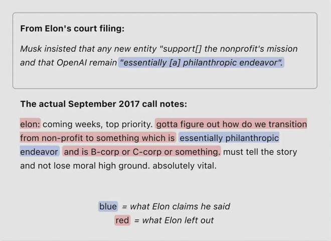Brockman 还总结道:“在马斯克不知情或不同意的情况下,把非营利组织从他手里偷走、强行改成营利性公司,这种做法是错误的,那样做会显得相当道德败坏,而且他真的不是傻子。”