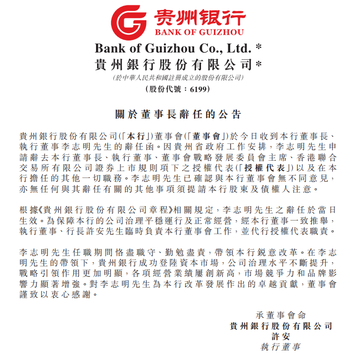 图片系贵州银行彼时公告董事长李志明离任