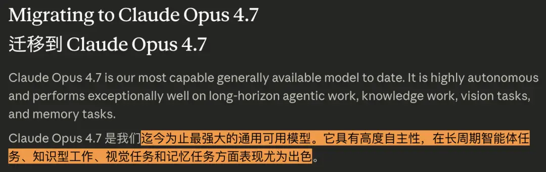Anthropic在官方迁移指南中指出,Opus 4.7 相比4.6存在若干行为变化,同时也强调,Opus 4.7仍是其当前综合能力最强的通用可用模型,在长周期智能体任务、知识型工作、视觉任务和记忆任务方面表现尤为出色。