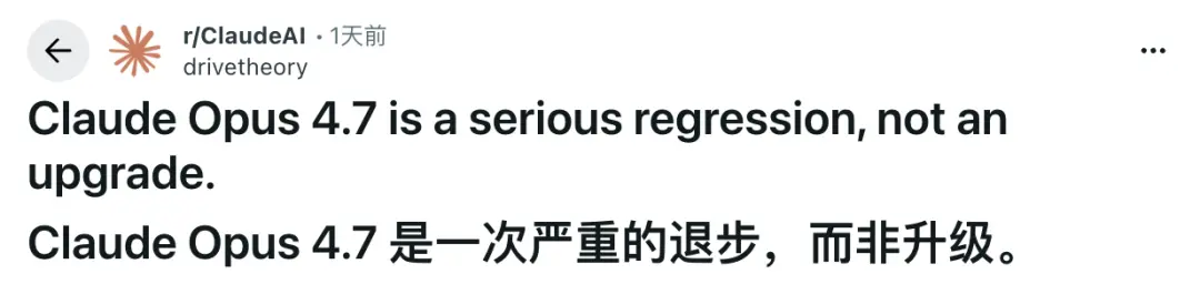 一篇“Claude Opus 4.7是严重倒退,不是升级”的Reddit帖子迅速冲上3000赞。