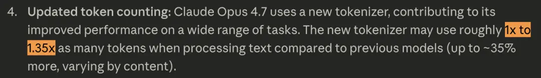 什么意思?你昨天用4.6跑一段prompt花10美元,今天换4.7跑同一段prompt,可能要花11到13.5美元。