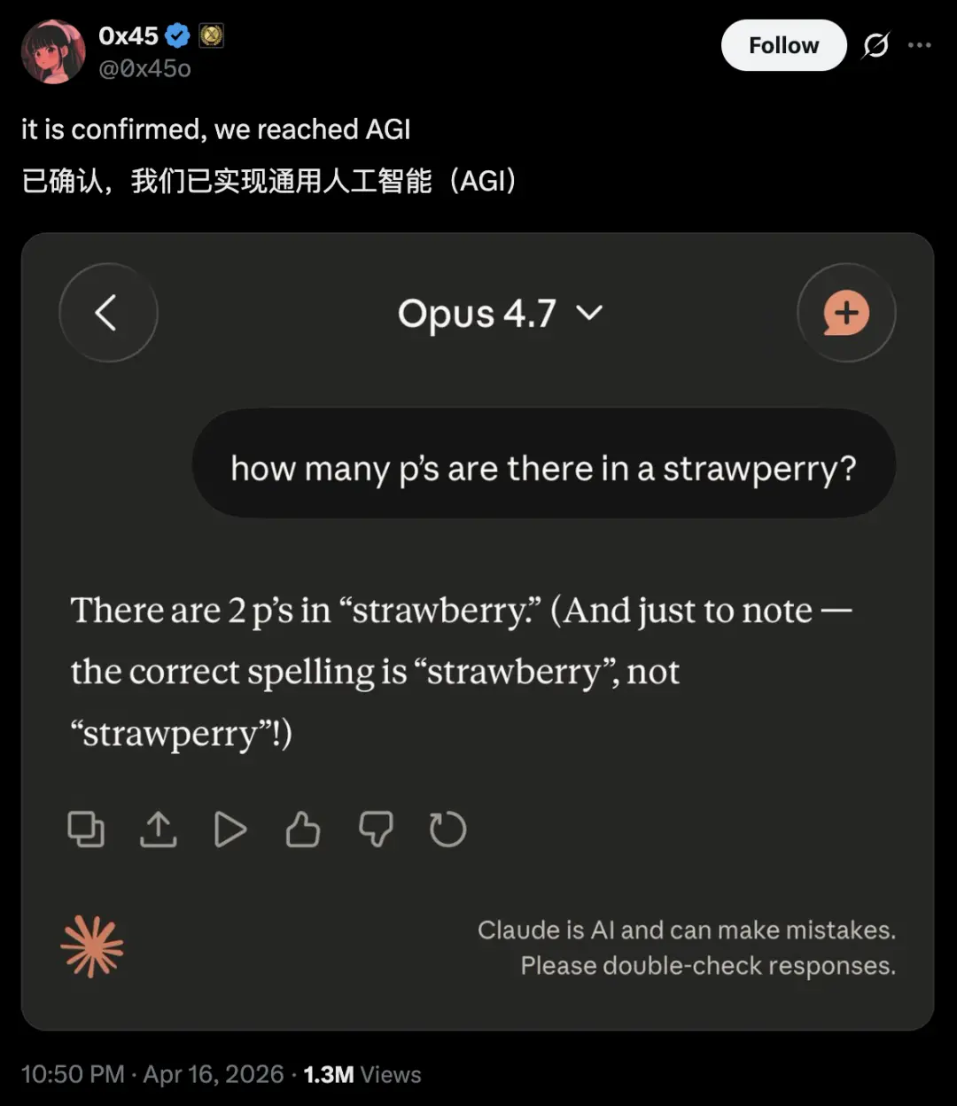 还有网友说,Claude Opus 4.7 已实现通用人工智能(AGI)。