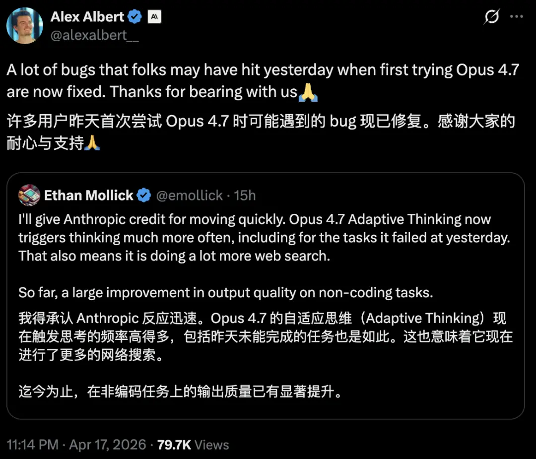 很多人在昨天刚开始体验Opus 4.7时可能遇到的bug,现在都已经修复了。感谢大家的包容和耐心。