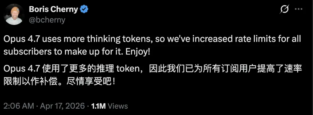 Opus 4.7消耗更多thinking token,所以我们已为所有订阅用户提高了速率限制,来补偿这一点。