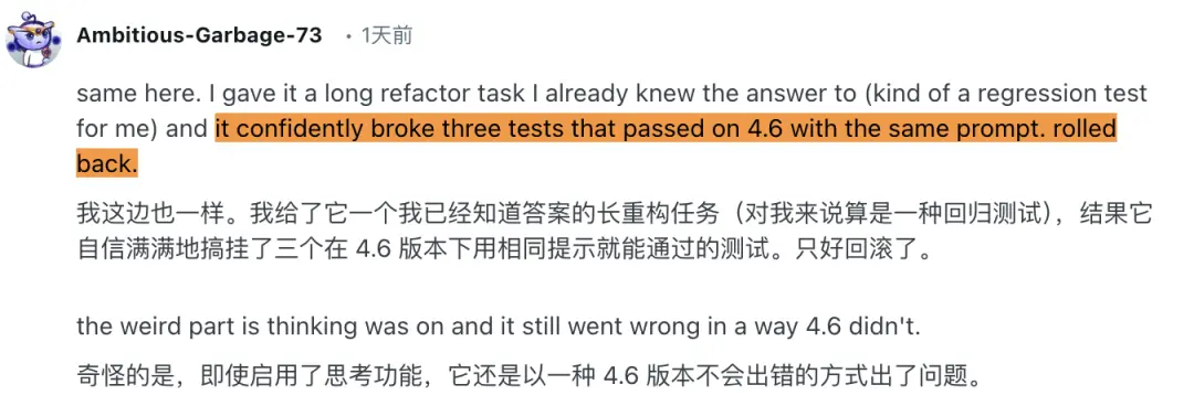 一位Reddit用户说,他用一个已知答案的长重构任务做回归测试,结果模型自信地改挂了3个原本在4.6下能通过的测试,只能回滚。