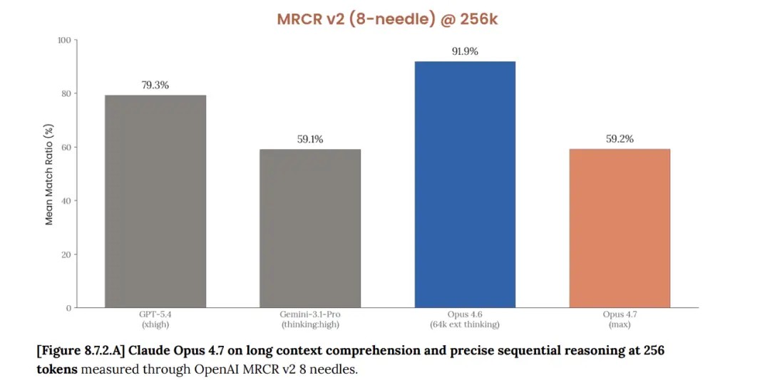 另一份数据来自Anthropic提供的Opus 4.7 System Card中100万token上下文的MRCR v2基准测试:4.6得分78.3%,4.7得分32.2%,下跌46个百分点。