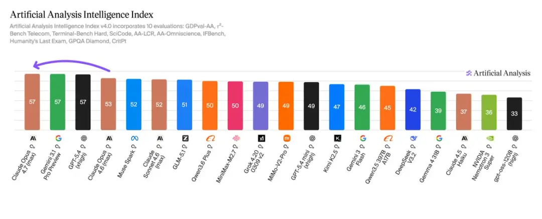 Artificial Analysis给Opus 4.7的Intelligence Index打了57分,和GPT-5.4、Gemini 3.1 Pro并列全球第一。
