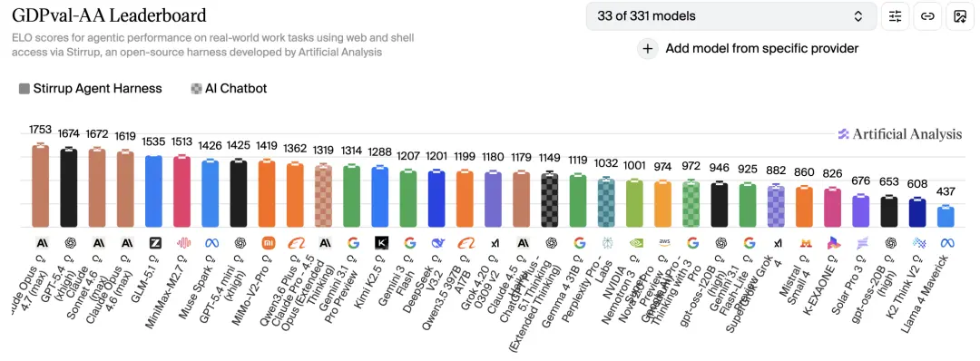 据Artificial Analysis的公开评测,Opus 4.7在GDPval-AA上拿到1753 Elo,领先第二名79分。