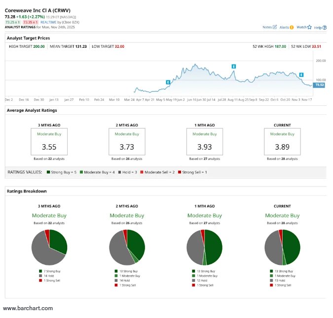 在覆盖CoreWeave股票的28位分析师中,13位给予“强力买入”评级,1位给予“适度买入”评级,13位给予“持有”评级,1位给予“强力卖出”评级。目前该股平均目标价为131.23美元,显著高于当前约73美元的价格。