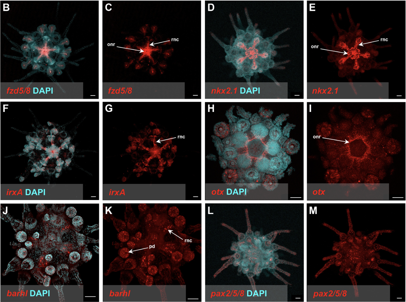 研究团队将海星切成薄片,从三个不同的方向检测了基因表达的差异,最终确定海星的头也是全身分布的。具体来说,海星的头分别位于身体的中心,以及每条“手臂”的中心。而与躯干有关的基因,只出现在海星“手臂”非常边缘的位置。