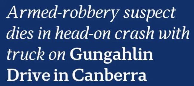 澳洲广播公司报道称,堪培拉Dickson区一家外币兑换店遭持械抢劫。嫌犯在逃跑途中遭遇车祸,重伤不治。