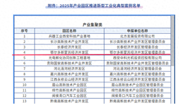 记者11月19日从内蒙古自治区工信厅了解到,近日,工信部公示2025年产业园区推进新型工业化典型案例名单,鄂尔多斯蒙苏经济开发区成功入选。