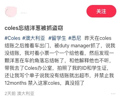 一位华人网友发帖说,她在Coles结账后推着购物车准备离开,结果突然被 duty manager经理拦住,说她“没结账”。