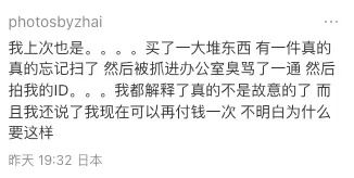 “我上次也是……买了一大堆东西,有一件真的真的忘记扫了,然后被抓进办公室臭骂了一通,然后拍我的ID……我都解释了真的不是故意的了,而且我还说我现在可以再付钱一次,不明白为什么要这样。”
