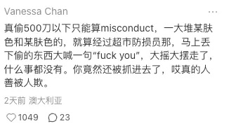 “真偷500刀以下只能算misconduct,一大堆某肤色和某肤色的,就算经过超市防损员那,马上丢下偷的东西大喊一句‘fuck you’,大摇大摆走了,什么事都没有。你竟然还被抓进去了,哎真的人善被人欺。”