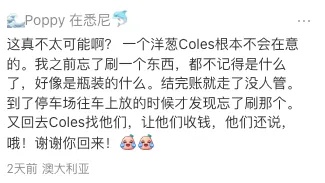 “这真不太可能啊?一个洋葱Coles根本不会在意的。我之前忘了刷一个东西,都不记得是什么了,好像是瓶装的什么。结完账就走了没人管。到了停车场往车上放的时候才发现忘了刷那个。又回去 Coles 找他们,让他们收钱,他们还说,哦!谢谢你回来!”