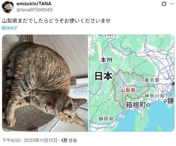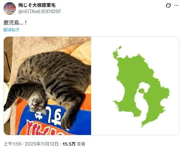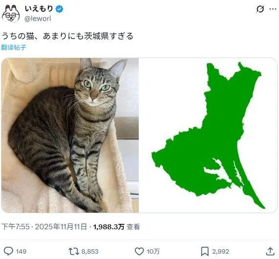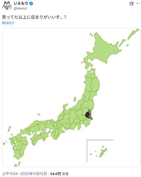 11月11日,铲屎官在推特上分享了这张照片,配文“我家的猫,太茨城县了”。