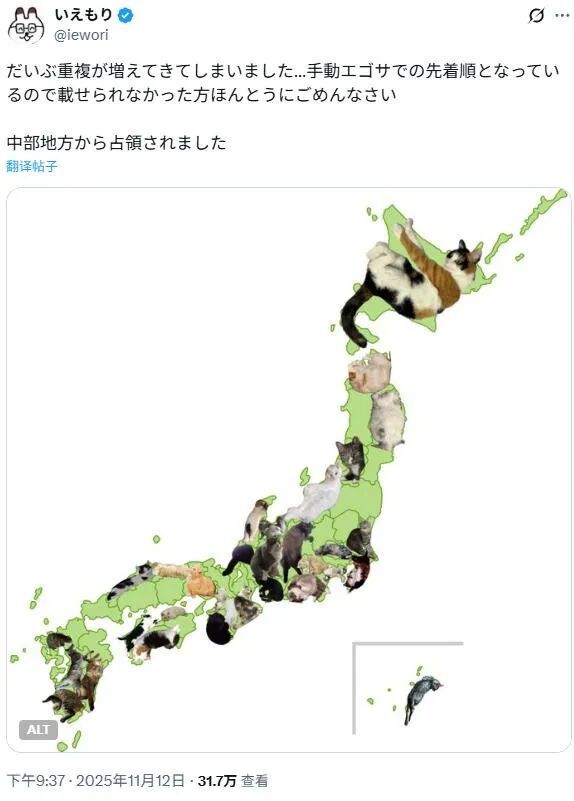 来自日本各地的铲屎官们迅速行动起来,分享自家“地图猫”的照片: