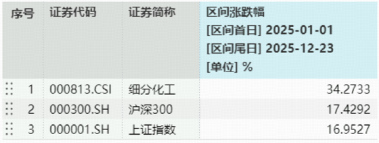 注:统计区间为2025年1月1日至2025年12月23日,细分化工指数近5个完整年度的涨跌幅为:2020年,51.68%;2021年,15.72%;2022年,-26.87%;2023年,-23.17%;2024年,-3.83%。指数成份股构成根据该指数编制规则适时调整,其回测历史业绩不预示指数未来表现。