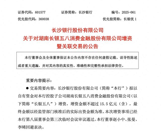 12月15日晚间,长沙银行发布公告,为增强长银五八的资本实力与风险抵御能力,推动其健康可持续发展,该行拟以自有资金对其进行增资,增资金额不超过15.5亿元,最终出资金额以经监管部门核准后的实际出资金额为准。本次增资事项已通过董事会审议,后续尚需提交该行股东会审议通过后,再报请监管部门批准后才能实施。