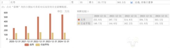 根据2022-2024年年报显示,在兼任博创科技股份有限公司董事长后,庄丹的薪酬水平从297.7万元增长至2024年的563.5万元,远高于行业平均薪酬。