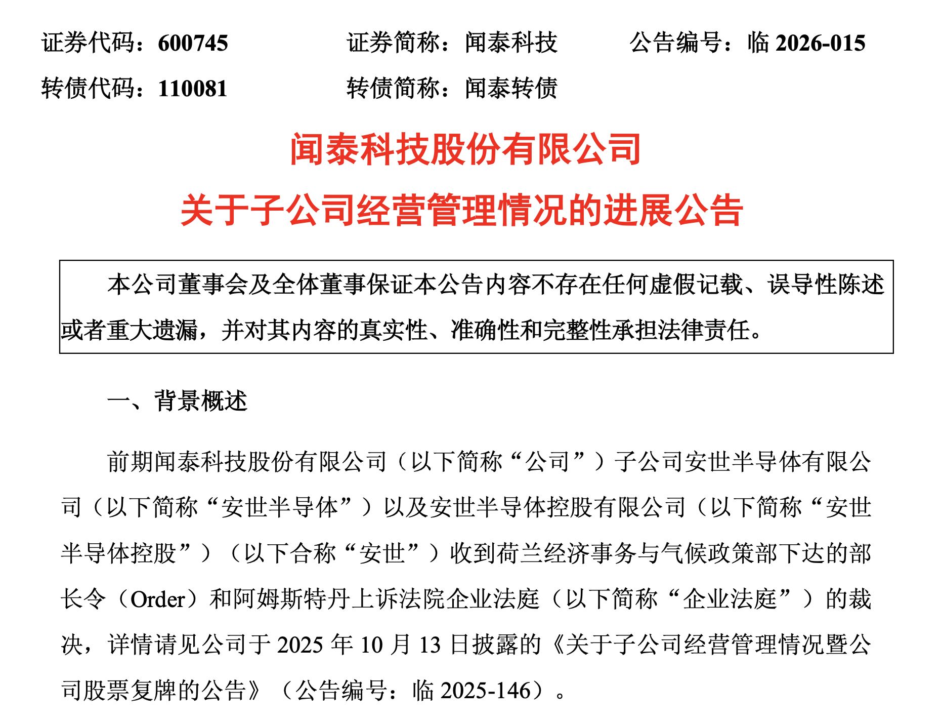 谈及业绩变动的原因,闻泰科技表示,2025年第四季度,公司子公司安世半导体有限公司以及安世半导体控股有限公司收到荷兰经济事务与气候政策部下达的部长令(Order)和阿姆斯特丹上诉法院企业法庭的裁决。截至本报告期末,虽然上述部长令(Order)被宣布暂停,但企业法庭裁决依旧处于生效状态,公司对安世的控制权仍暂处于受限状态。公司报告期内预计将确认较大金额的投资损失、资产减值损失,对公司2025年度业绩将造成较大影响。
