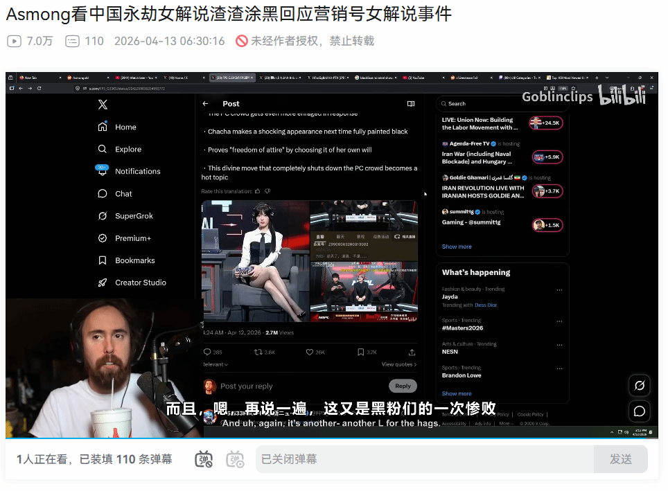 这一极具冲击力的出场方式也引起了海外大咖Asmongold的注意。他在直播中针对此事发表了言辞犀利的看法,重点分析了舆论背后的心理逻辑: