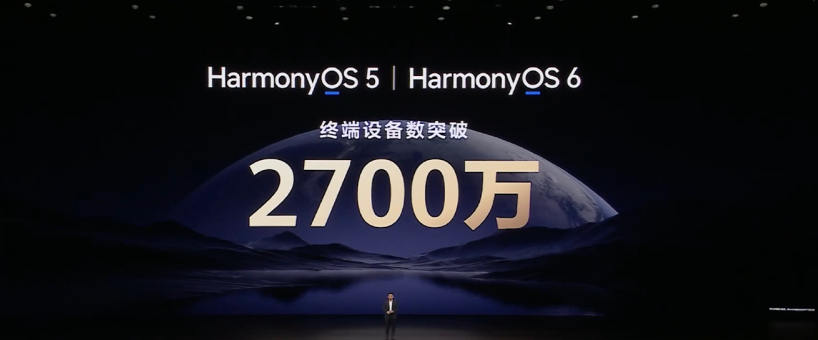 余承东介绍,目前搭载HarmonyOS 5和HarmonyOS 6的终端设备数已经突破2700万台。