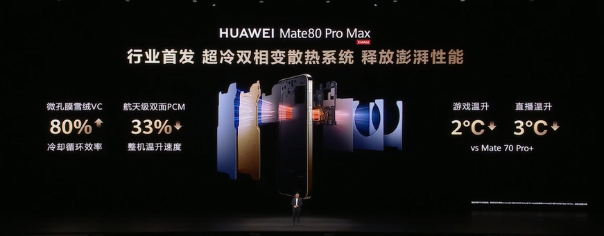 首发预装HarmonyOS 6系统,整机性能相较上代大增,华为Mate 80、Mate 80 Pro比前代性能提升35%以上,华为Mate 80 Pro Max搭载了超冷双相变散热系统,性能提升42%以上。