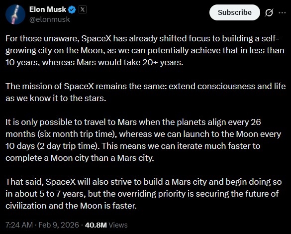 没人知道马斯克何时用月球取代了心心念的火星,他一年前还宣称月球是前进道路上的干扰因素。也许贝佐斯的蓝色起源载人运输系统对SpaceX构成了实质性威胁,使马斯克认识到必须抢在对手之前实现太空定居,月球基地是最现实的选择。